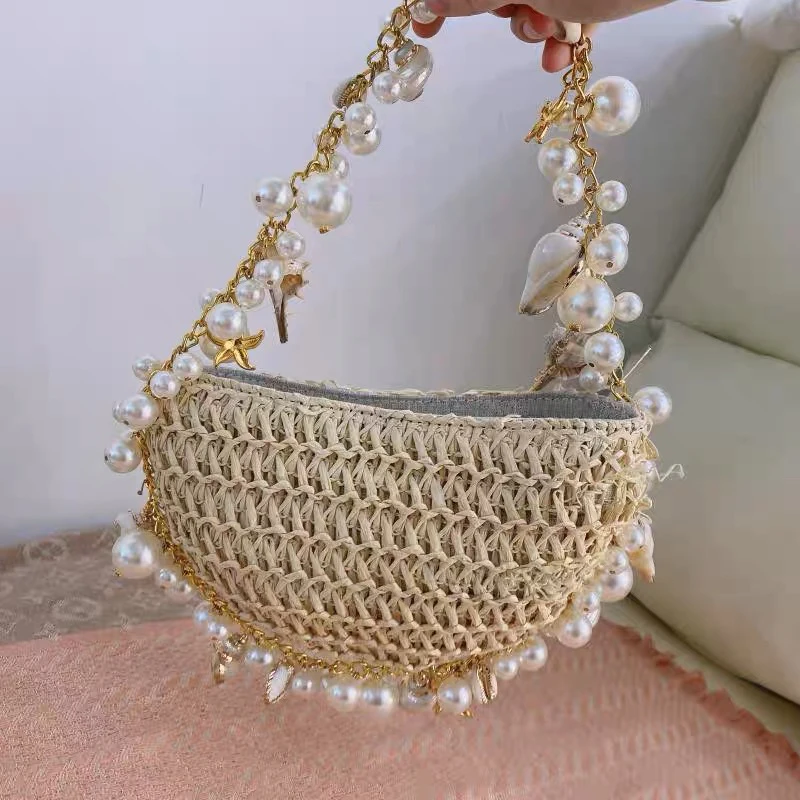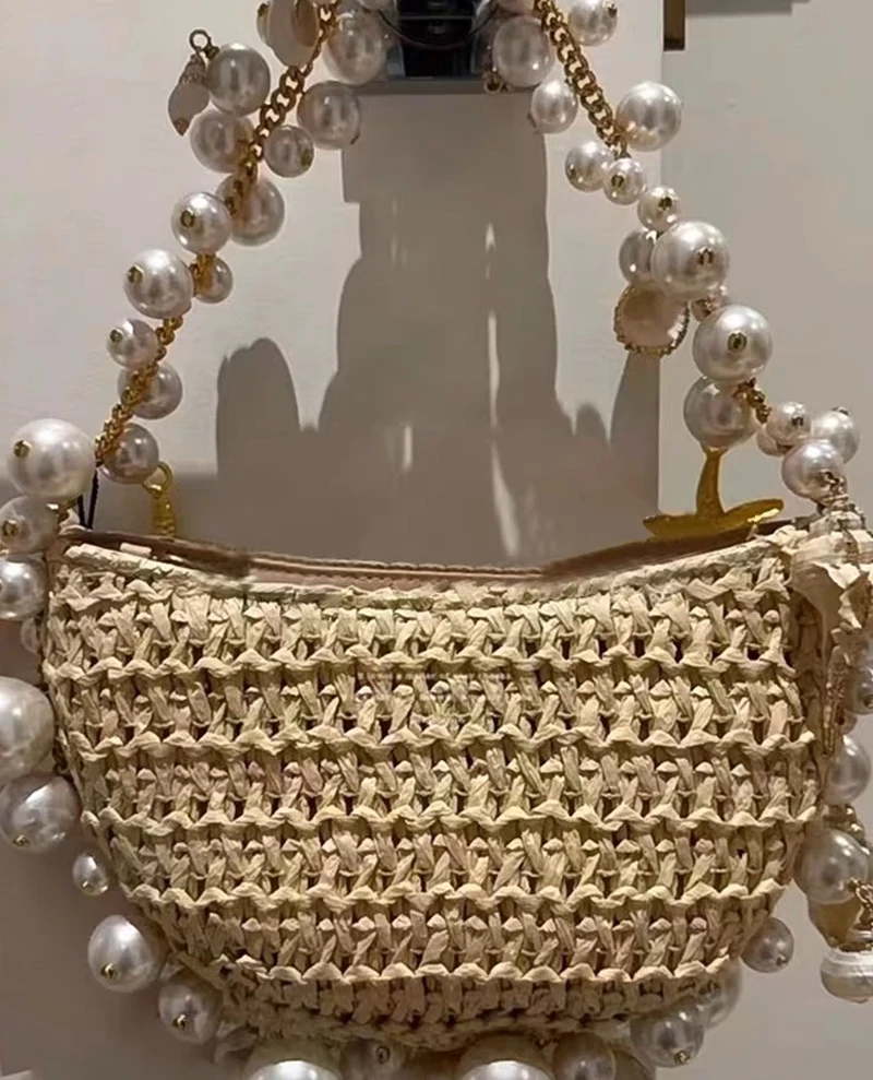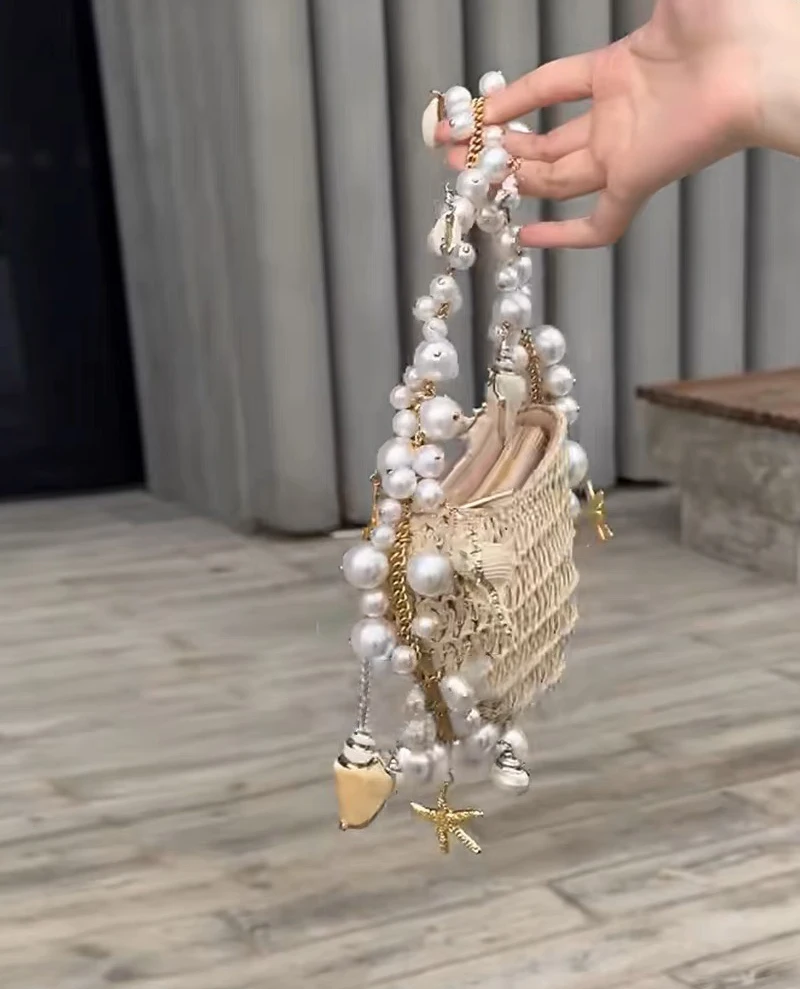 Lady Evening Bags For Women Luxury Designer Brand Handbags And Purses 2023 New In Papyrus Woven Chain Beaded Trim Shoulder Bag